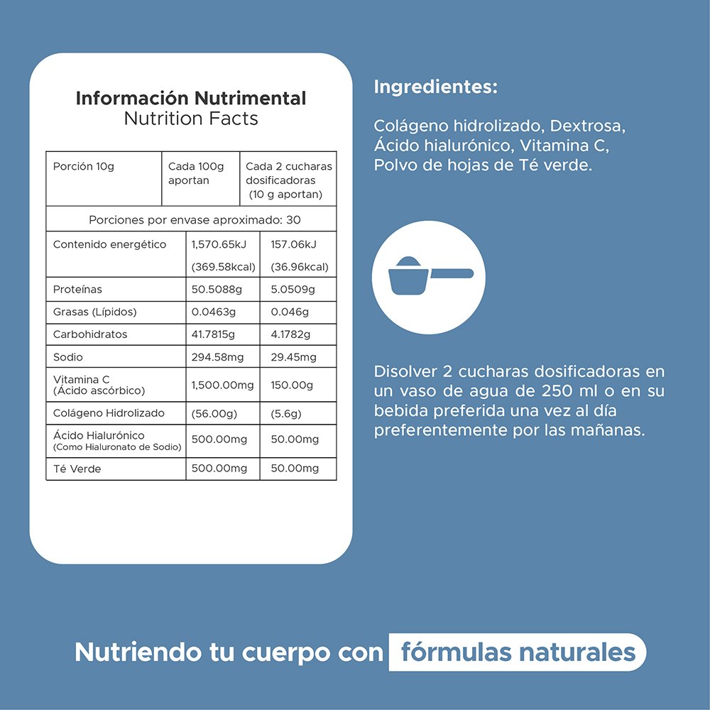Modo de uso: Disolver 2 cucharas dosificadoras en un vaso de agua de 250 ml o en su bebida preferida una vez al día preferentemente por las mañanas.