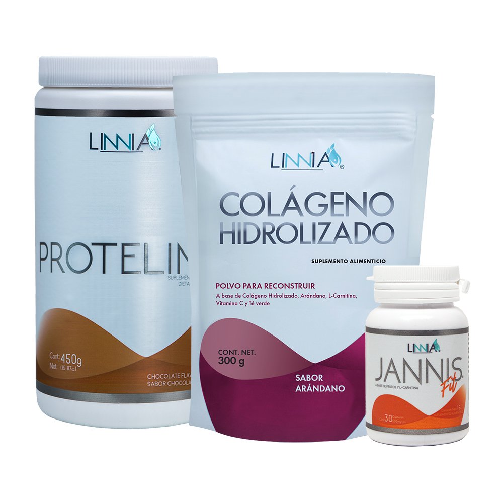 El Kit PROTELINN + COLÁGENO ARÁNDANO + JANNIS FIT combina tres suplementos alimenticios formulados con ingredientes de origen natural, proteínas, extractos vegetales, vitaminas y aminoácidos. Esta combinación está diseñada para complementar rutinas de alimentación balanceada y actividad física, aportando ingredientes que forman parte del bienestar del organismo y del cuidado integral dentro de la rutina diaria.